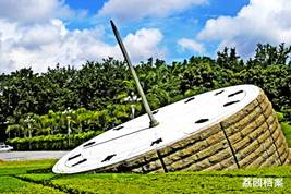 这座“日晷”雕塑,不仅极具观赏性,作为一个巨型的钟表,其报时准确度也是极高的。在进行设计时,设计师在日晷表盘上刻上了十二时辰,指杆的投影准确无误地落在相应刻度上,毫无偏差。